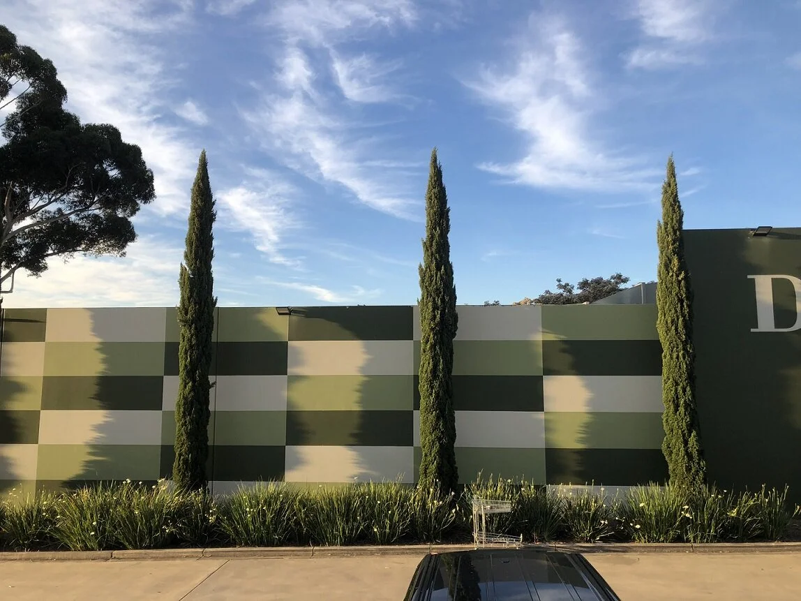 Archetypal commercial landscape 2020: pencil pines, African Iris (Dietes bicolor) understorey & cement wall backdrop with matching colour scheme under a Mediterranean sky. This forms the border between a petrol station and a bottle shop (double whammy!)