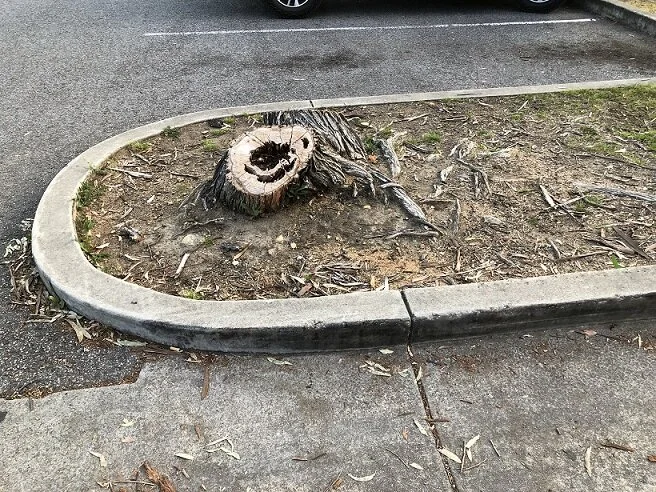 Melaleuca stump remnant & exposed root base in U-shaped car park divide at the Bridgewater Coles Shopping Centre.