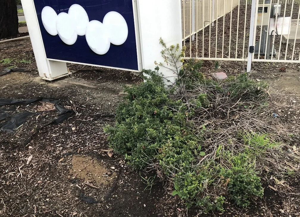 Masterful combination feature at same Belair site: well-trodden Correa with denuded bark chip mulch & exposed weed mat base, all against neon gaming sign backdrop. They missed a rhyme chance here with Correa & scoria. Perhaps the colour clash would have been too much.