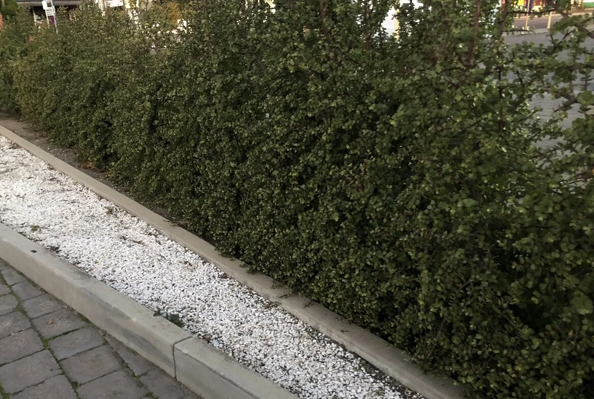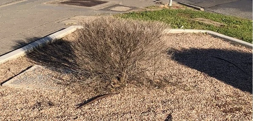 Classic original style near Kilburn in Adelaide’s inner north – deceased Diosma over pink pebble base & exposed brown dripper pipe, framed in asymmetrical concrete border at traffic junction.